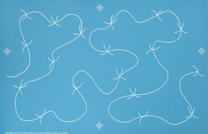 This is a great pattern for those western themed quilts! In fact you might want to match it up with our adorable cowboy boot border (see #40029) Dusty Farrell’s distinct designs are great free motion patterns that will not only deliver great aesthetic results but as you use them you will be sharpening your skills to go beyond the markings and do your own free motion quilting if you want to! We have a collection of 7 so far so check them all out #45000 to #45006. This stencil is 9″ wide with a 16″ repeat.