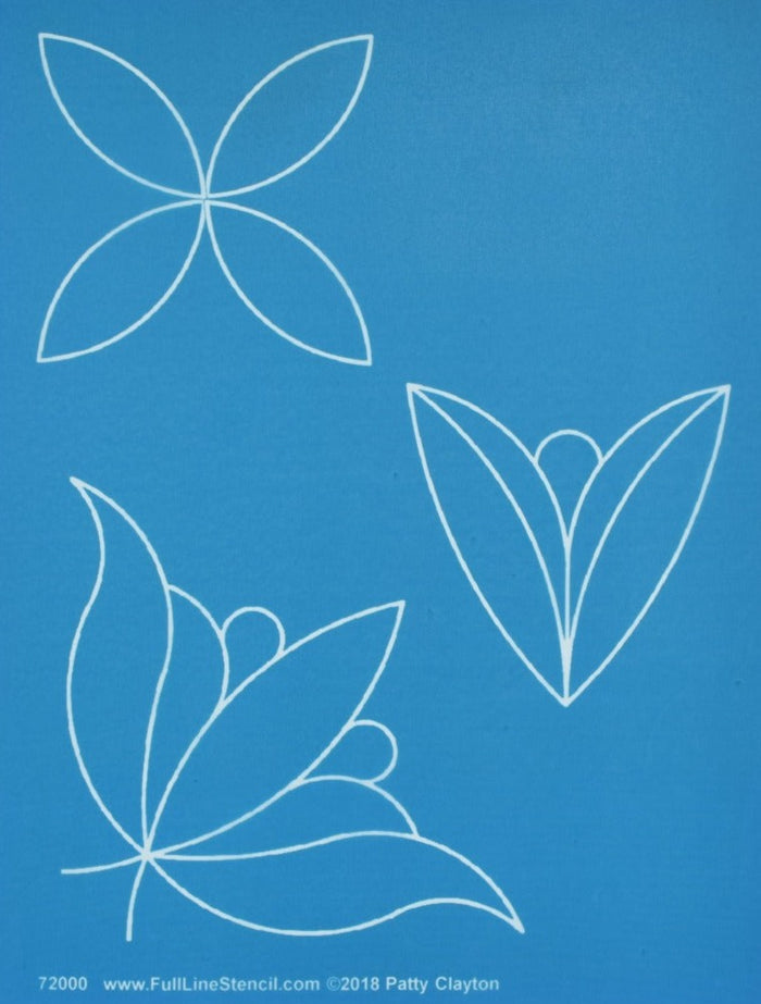 This Full Line Stencil pattern was designed by Patty Clayton specifically for the Disappearing Hourglass quilt pattern – although you can use it any way you want. What a fun way to quilt this pattern though! It looks hard but it’s an easy quilt to make with precut layer cake fabrics. Check out the video on YouTube by Jenny Doan from Missouri Star Quilt Co. Now you can get a stencil to fit it perfectly! You can use it in other 10" blocks too, there are a few examples in the gallery. The four petal design measures approx. 3 1/2" square along with the flower bud. The open flower design is approx. 5" x 5" ©2019 Patty Clayton